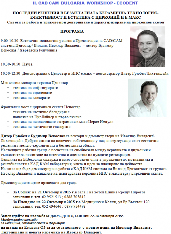 CAD CAM BULGARIA WORKSHOP - ECODENT Последни решения в безметалната керамична технология - ефективност и естетика с цирконий и Е.Макс