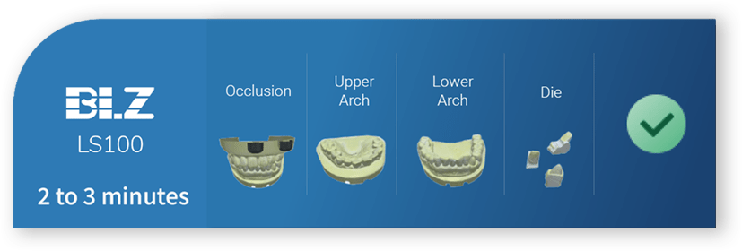 Използвайки усъвършенствана AI технология, лабораторният скенер BLZ Dental LS100 става първият в света лабораторен скенер без последваща обработка. Интегриран със собствено разработен интуитивен софтуер за сканиране, лабораторният скенер отнема само 2 минути, за да завърши целия процес на сканиране, което увеличава ефективността на стоматологичния работен процес до 50%.